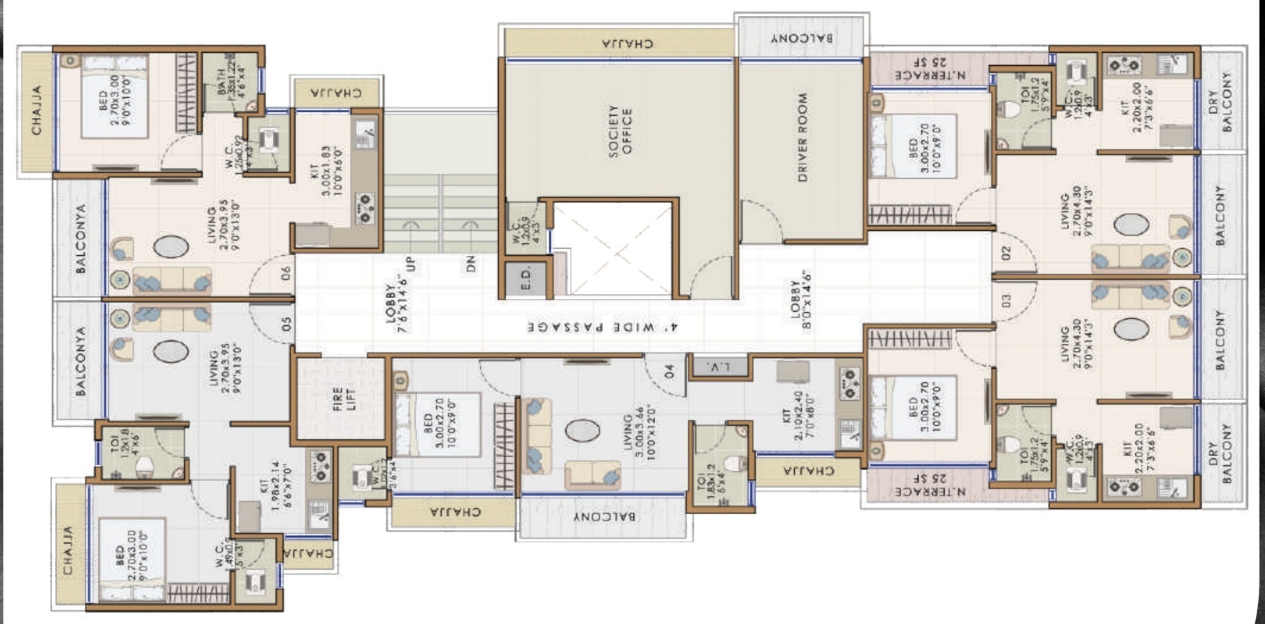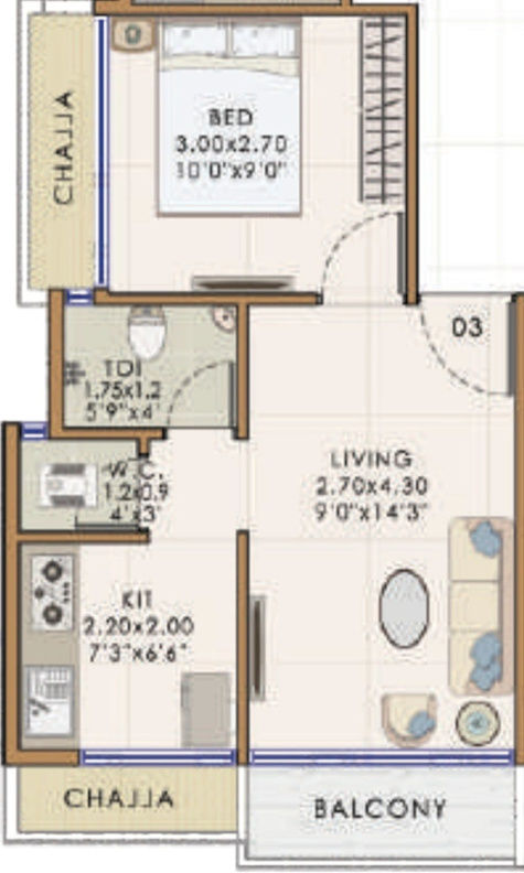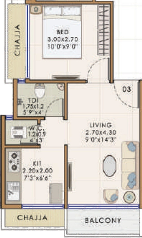 Carpet Area1 sq M = 10.76 sq ft