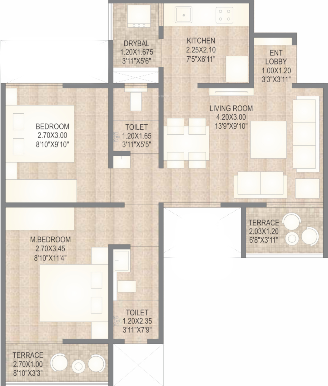 Carpet Area1 sq M = 10.76 sq ft