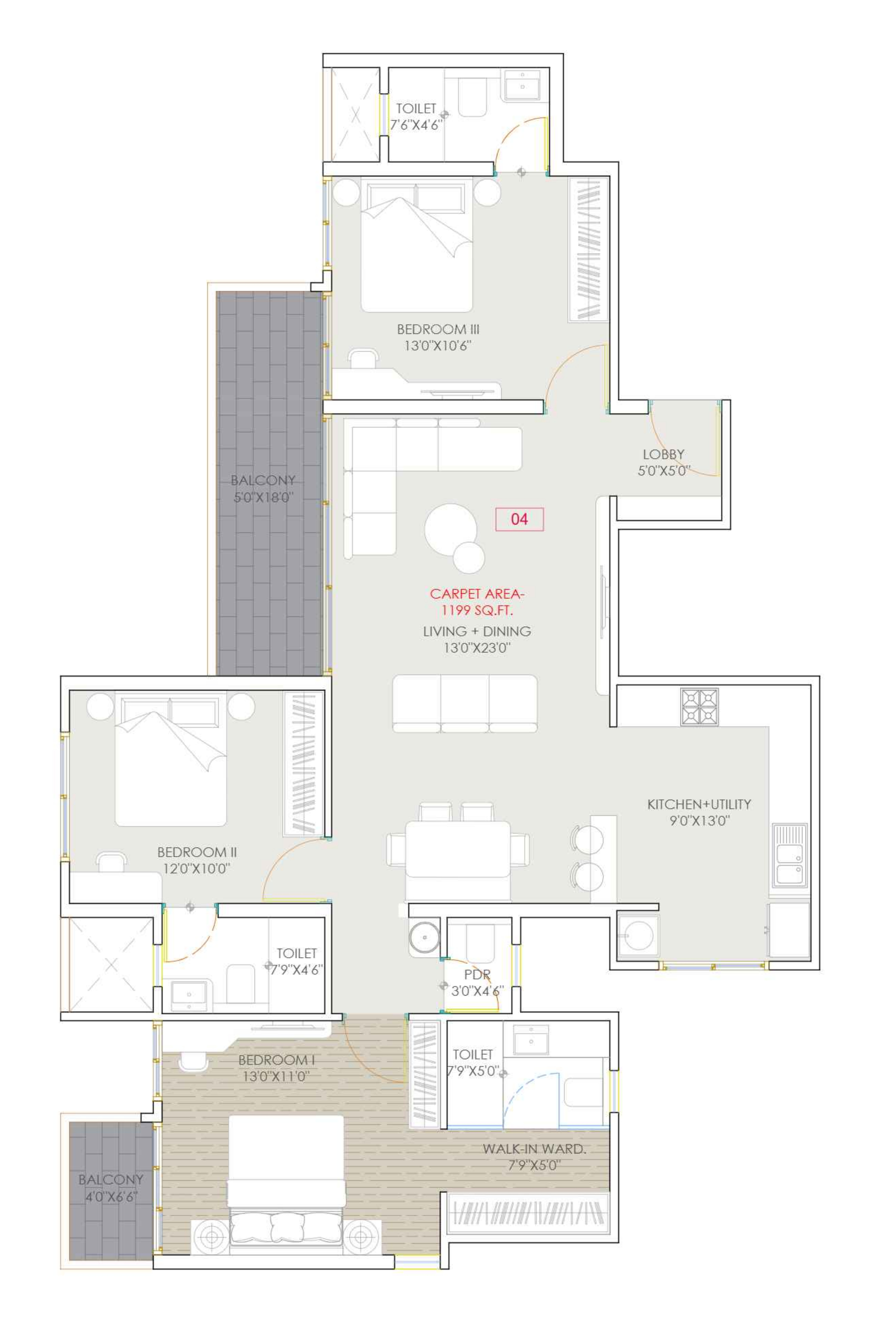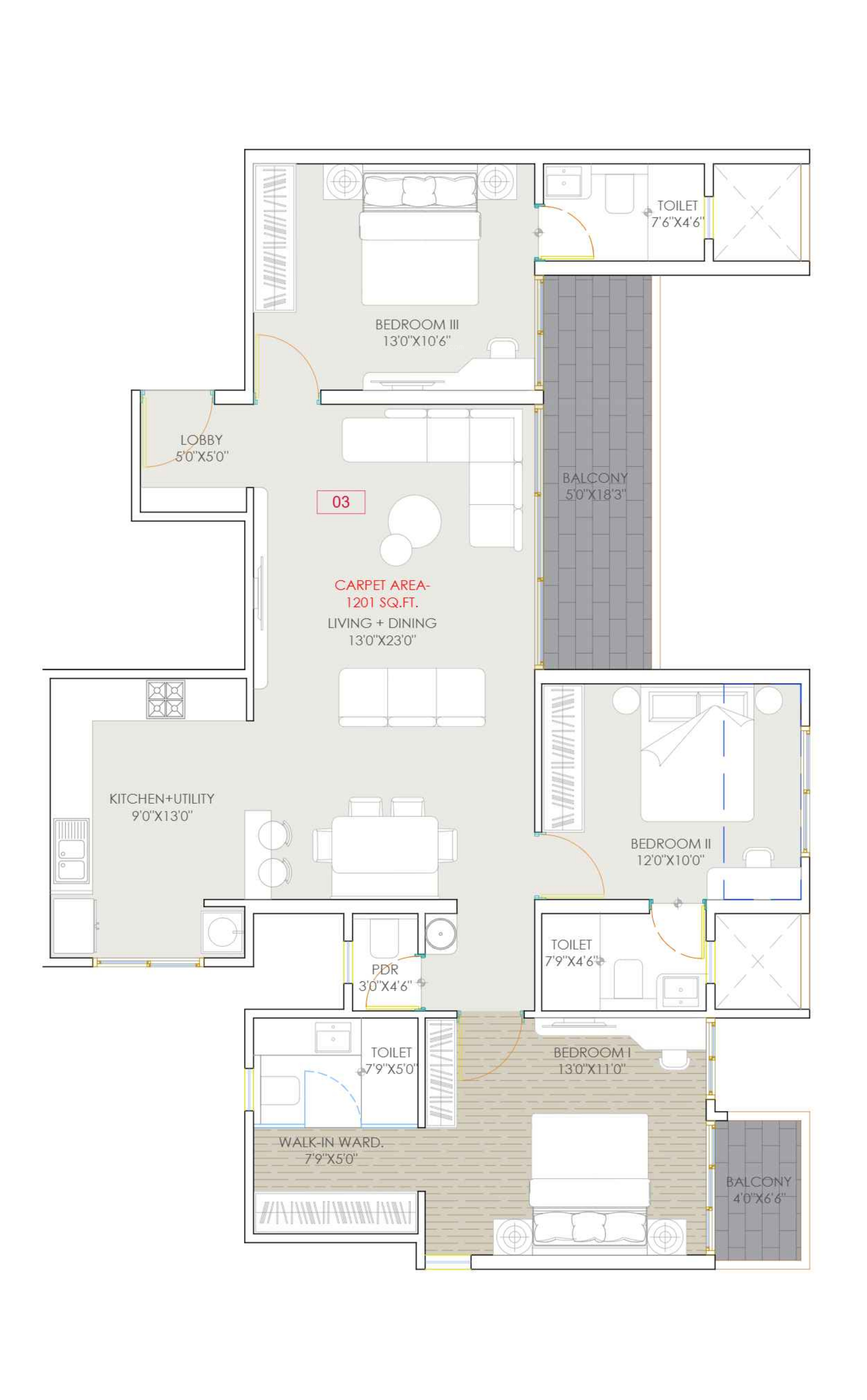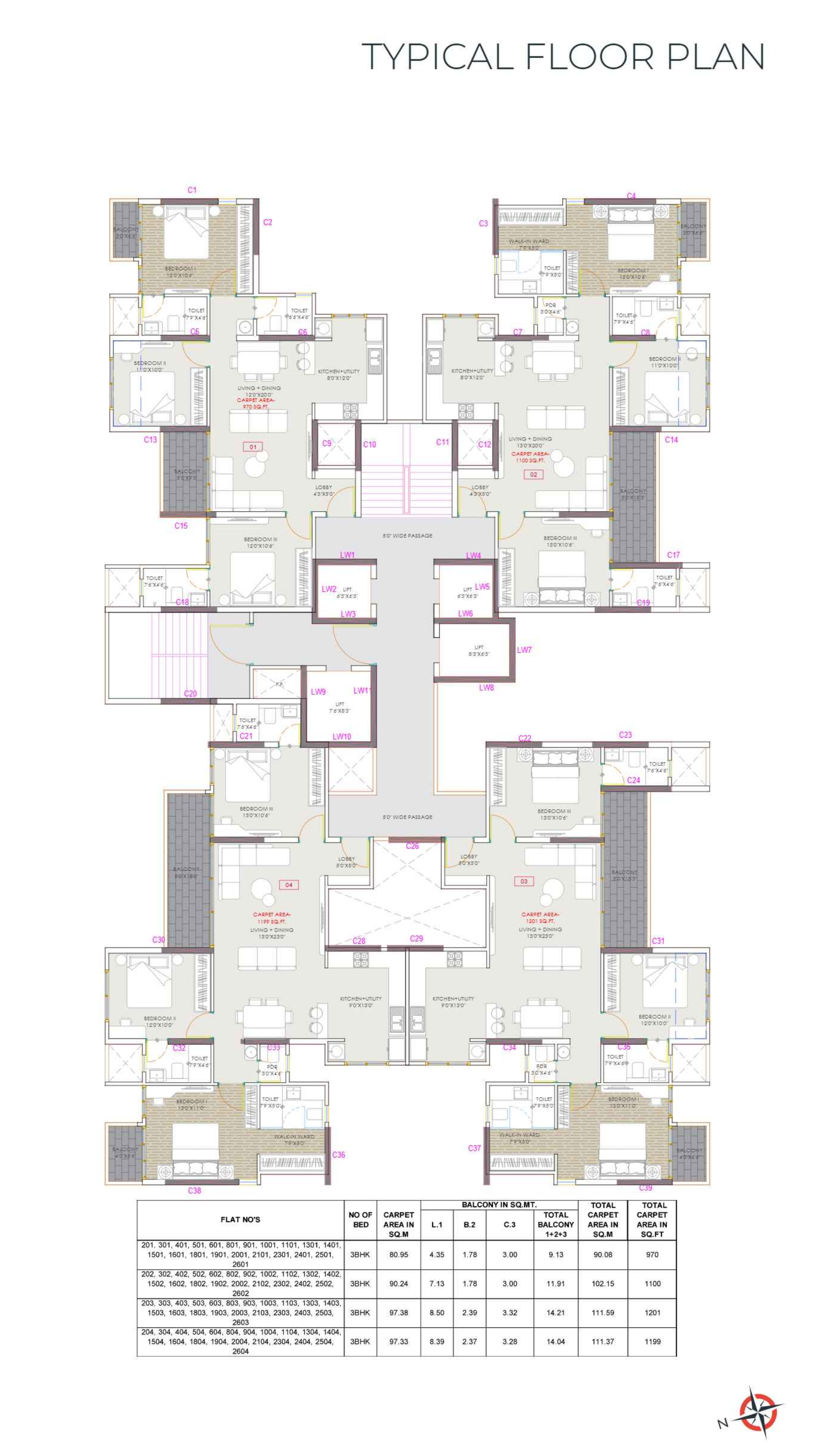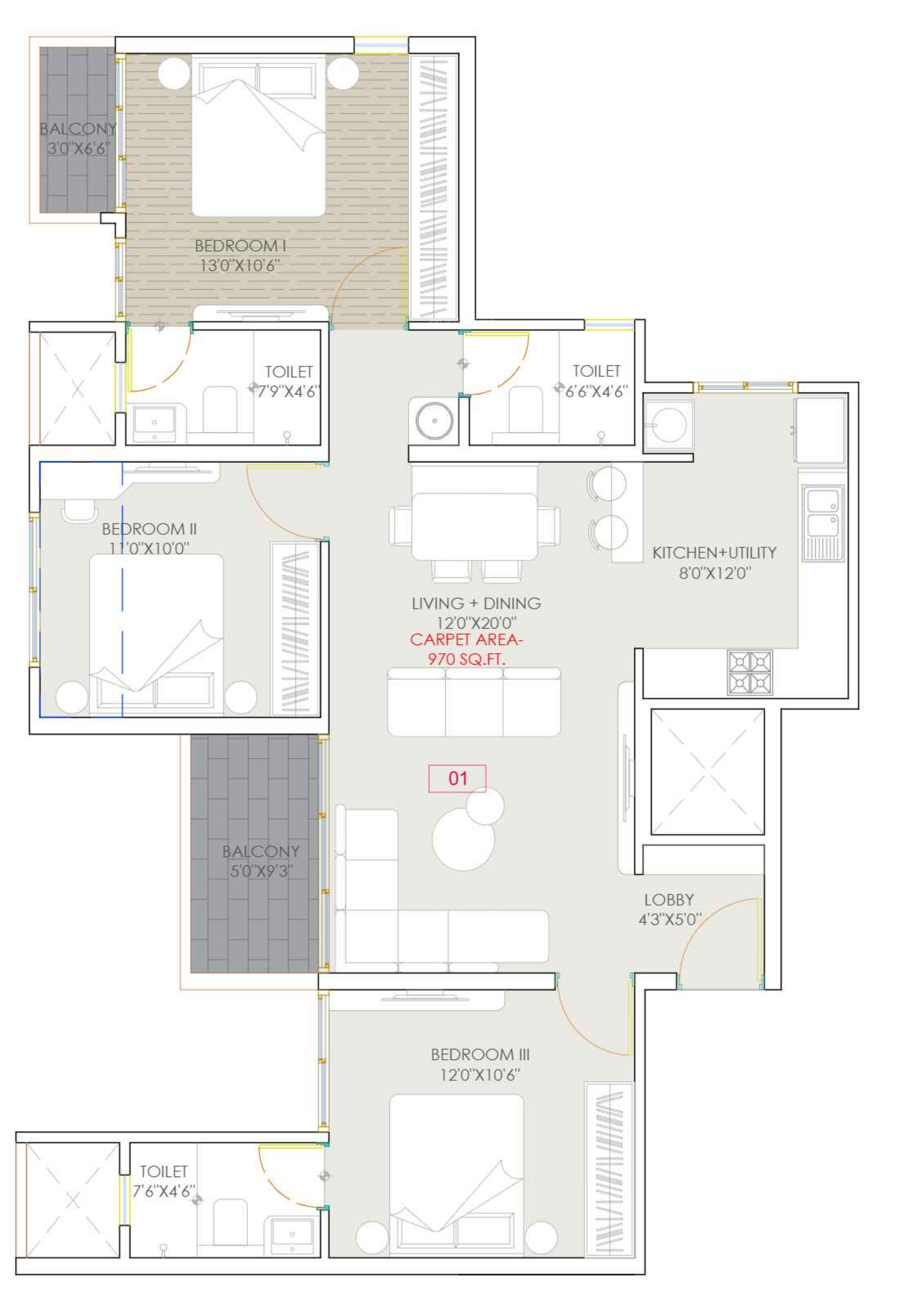 Carpet Area1 sq M = 10.76 sq ft